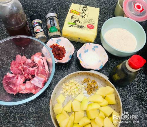 1,首先是制作米粉,先将大米放入锅中,炒至发黄放入搅拌机磨成粉。排骨洗净沥干水份。土豆洗净去皮切成滚刀块,姜、蒜去皮,磨成姜蓉、蒜蓉。米粉,一勺豆瓣酱