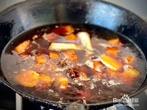 倒入开水,水要没过肉,因为一会儿要放入百叶结,百叶结比较吃水,所以水要比平时的红烧肉更多一些,大火烧开,转中小火慢炖