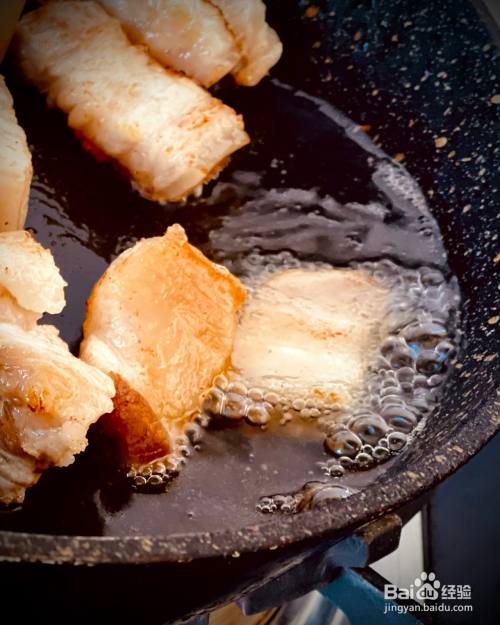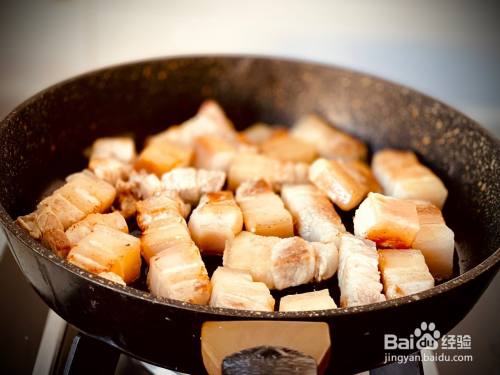 五花肉切小块,凉水下锅焯水,放几片姜片,一勺黄酒去腥。焯过水的五花肉晾干或用厨房纸擦干,放入平底不粘锅,锅中不放油,小火慢慢煎