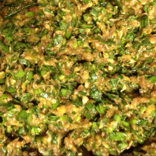 姜剁碎成姜末,和入韭菜,加橄榄油拌匀。
