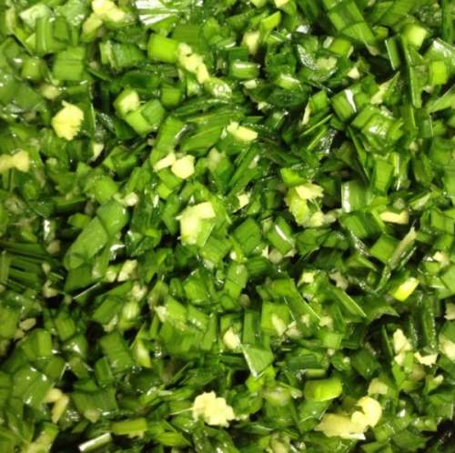 4姜剁碎成姜末,和入韭菜,加橄榄油拌匀。
