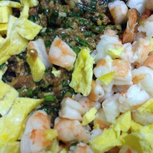 把步骤1和2中准备好的虾仁丁和鸡蛋丁倒入步骤6的馅料中,搅拌均匀,饺子馅完工。
