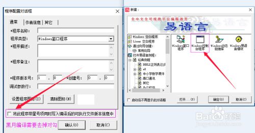 黑月具有减少编译后的程序体积、降低程序误报的能力,如需要将代码进行黑月编译,就不能在【新建】的时候选择【窗口程序】,因为黑月不支持易语言的窗口,声明易语言窗口类型的变量也是不可以的,需要选择【控制台程序】,并将【程序】->【配置】里面的程序类型更改成【窗口程序】,去掉“将此程序带星号项...”前面的对勾,如需要窗口就需要使用API自行创建或使用【黑月资源编辑器】创建。