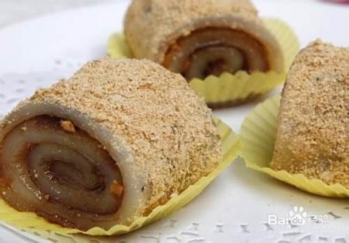 它的原料是用黄米面加水蒸熟,和面时稍多加水和软些。另将黄豆炒熟后,轧成粉面。制作时将蒸熟发黄米面外面沾上黄豆粉面擀成片,然后抹上赤豆沙馅(也可用红糖)卷起来,切成100克左右的小块,撒上白糖就成了。制作时要求馅卷得均匀,层次分明,外表呈黄色,特点是香、甜、粘,有浓郁的黄豆粉香味儿。豆面糕以黄豆面为其主要原料,故称豆面糕。但为什么又称“驴打滚”呢?似乎是一种形象比喻,制得后放在黄豆面中滚一下,如郊野真驴打滚,扬起灰尘似的,故而得名。这一点连前人也发出疑问。《燕都小食品杂咏》中就说:“红糖水馅巧安排,黄面成团豆里埋。何事群呼‘驴打滚’,称名未免近诙谐。”还说:“黄豆粘米,蒸熟,裹以红糖水馅,滚于炒豆面中,置盘上售之,取名‘驴打滚’真不可思议之称也。”