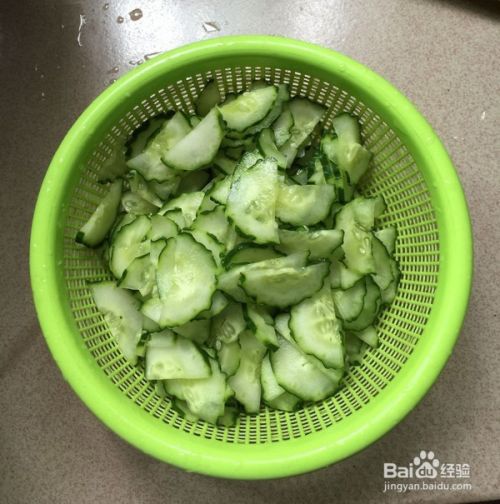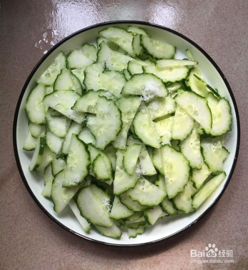 黄瓜,洗净后切均匀的薄片,撒入精盐,拌匀后腌5分钟