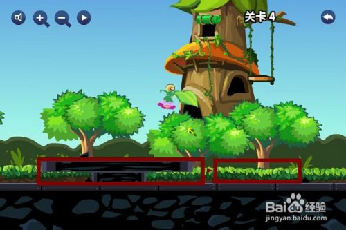 第四关,小火车铁道上有两个炸弹,要重新修一个火车道让小火车从炸弹上面过去,有一个长的和一个短的放在两个炸弹的中间,另外把一个三角形的放在左边炸弹的左边,可不要放错啊,放错的话小火车就过不去了。