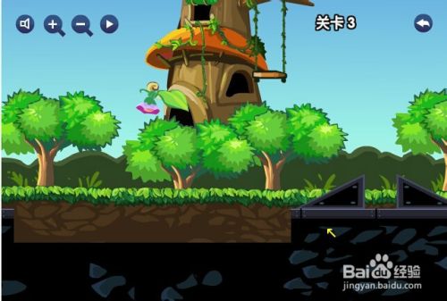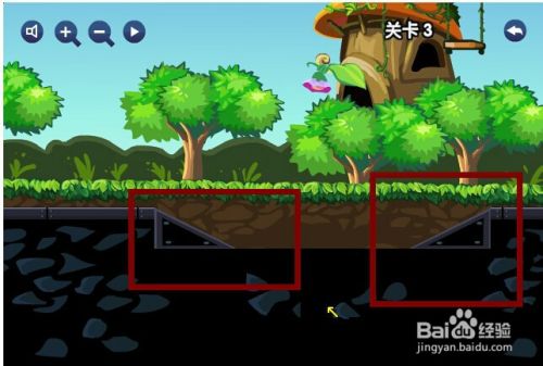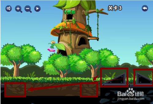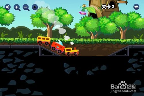 第三关,小火车火车道上左边和右边一样高,可是中间低了,那么就要两边都需要一个斜坡火车才可以顺利通关,用鼠标点住两个三角形石头分别放在两边就可以了。