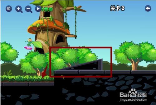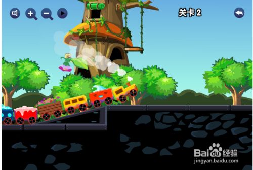 第二关,小火车火车道上左边低右边高,这样子火车就上不去,需要一个斜坡就可以上去了,用鼠标点住右边的三角形石头拖到下面就行了,过关。