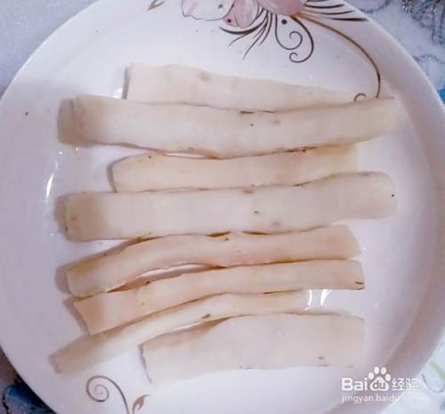山药去皮上锅蒸熟。给山药去皮时一定要带手套,以免引起皮肤过敏。