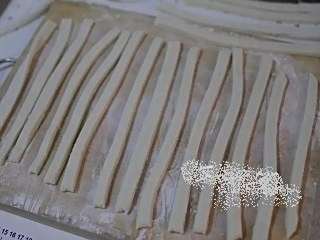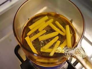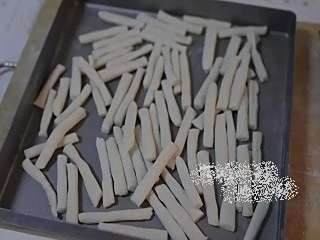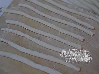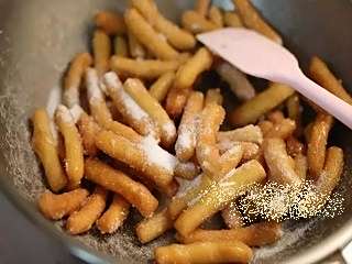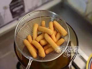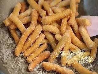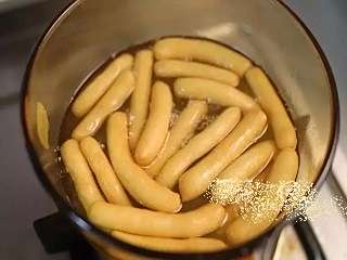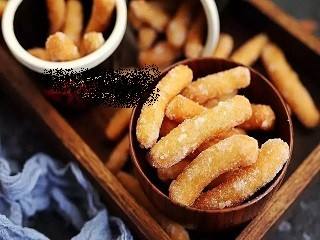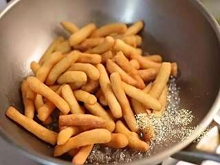 麦芽糖、白糖和清水放入锅内,加热,煮沸,加入面粉混合物,揉匀,擀成正方形,切成段状,放入油锅内,炸至金黄色。