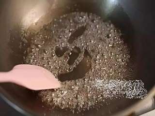清水和60g砂糖倒入锅内,加热,熬至变黄。