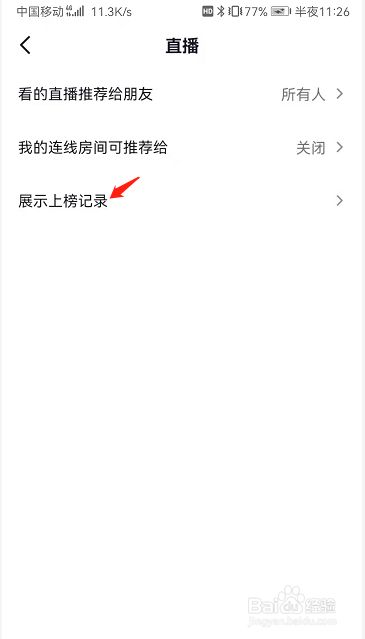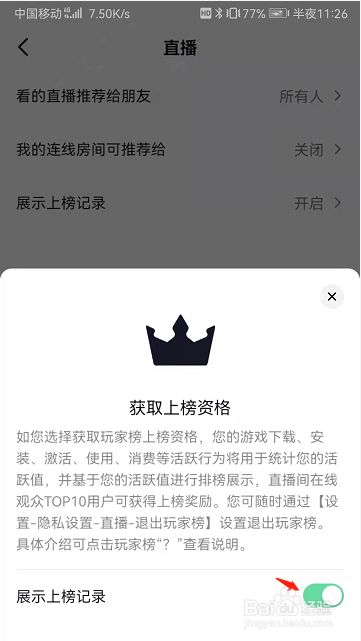 将展示上榜记录选项右边的开关打开即可开启展示上榜记录功能
