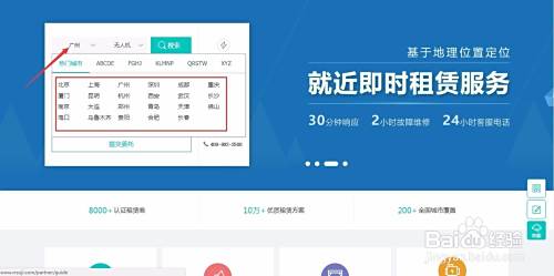 首先,基于自己的地理位置,应该选择在全国内有大疆无人机租赁业务的租赁公司,选择离自己最近的、口碑较为靠谱的租赁商提供服务。例如58同城和人人租机网提供类似服务,前者没有地理位置的标记现拿后者举例说明。直接进入官网后点击地理位置筛选需租赁的无人机的城市例如—广州。