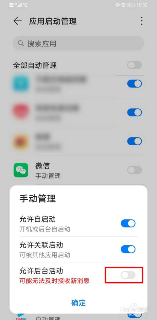 当手动管理的时候,看下运行后台活动的滑块是否打开,这里必须打开才行,要不然无法收到信息的。