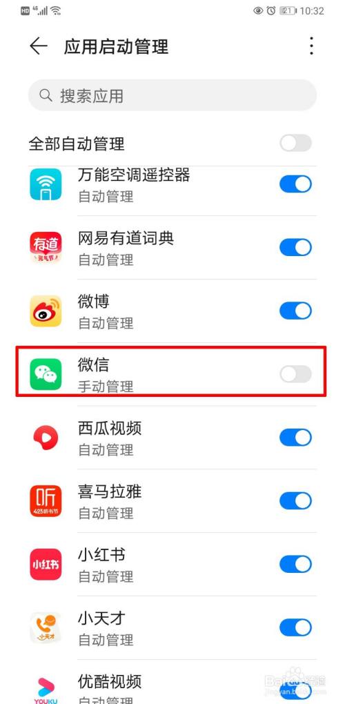看下应用启动管理中微信的滑块是否打开。没打开就是手动管理的。