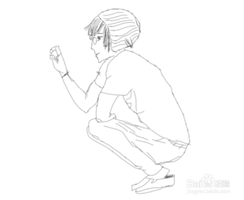 最后再画出人物的两条下蹲腿并在腿部上画出人物的脚及脚上穿的鞋子,这样人物的下蹲姿势就画好了,如图所示: