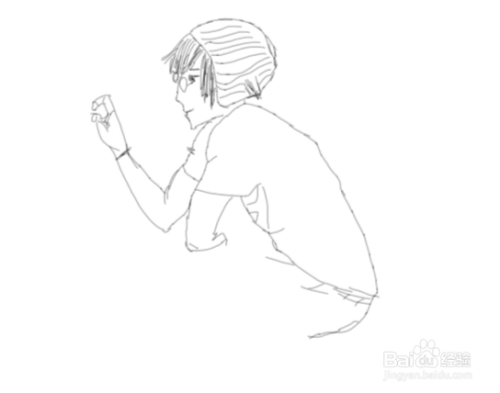 在人的胳膊及头部的基础上画出人物的背部,然后再画出人物的臀部,如图所示: