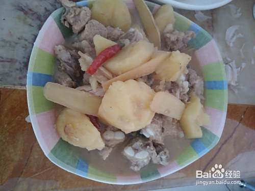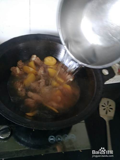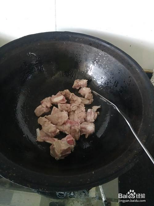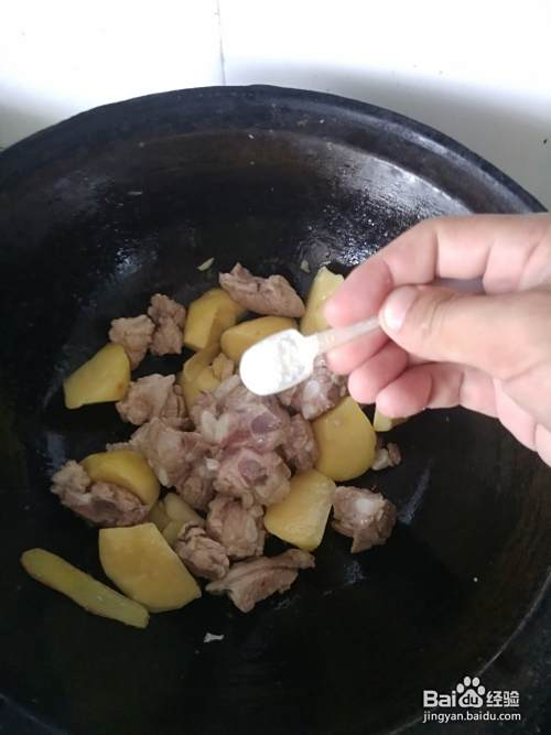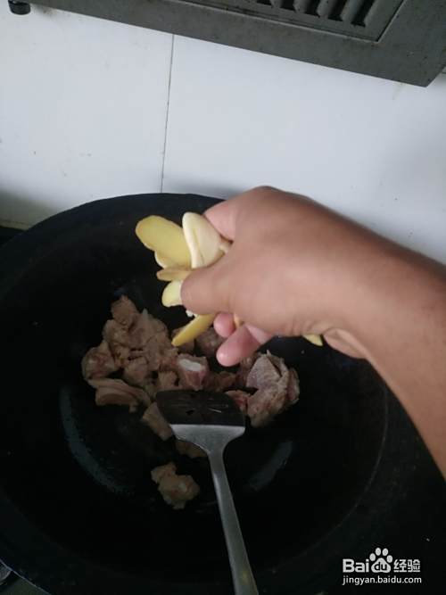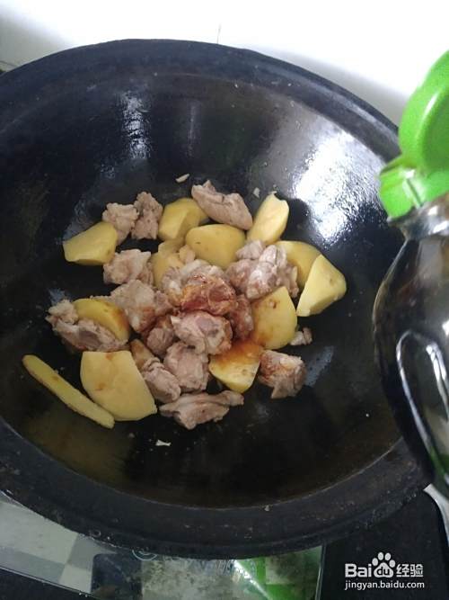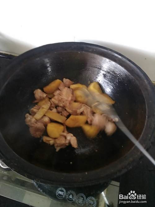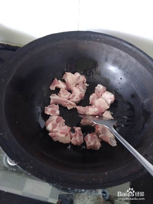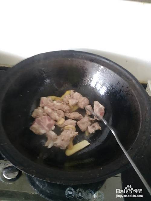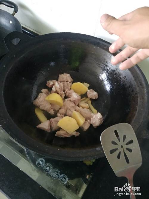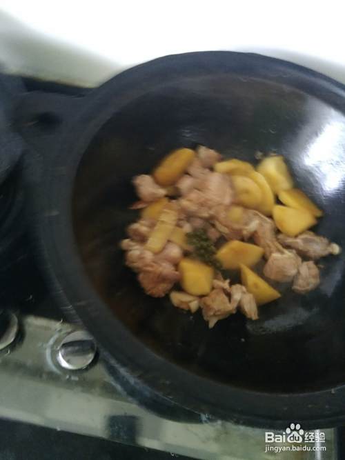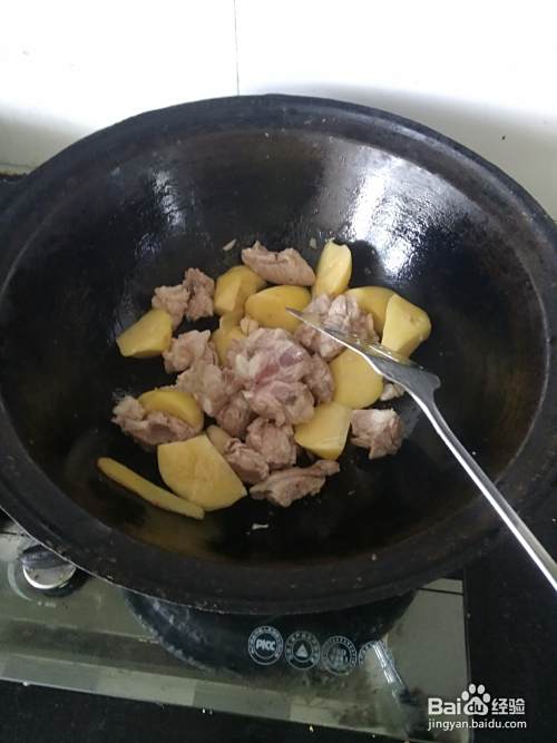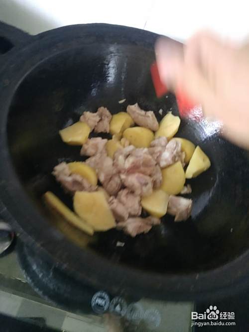 将猪脆骨下锅炒香后下入蒜瓣后翻炒均匀,再下入切好的土豆块继续翻炒