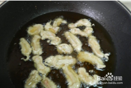 腌制好的肉条放入面浆中蘸裹,锅中油烧热,放入肉条。