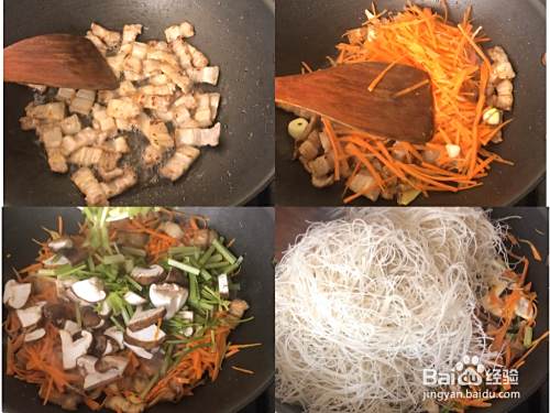 将五花肉翻炒至两面呈褐色,加入姜、蒜,翻炒数次,再加入胡萝卜炒软,加入香菇、芹菜,翻炒均匀,再加入米粉