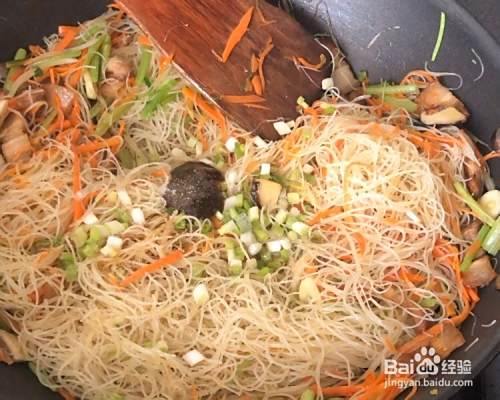 等面条变软后,撒入葱白末,再加入适量料酒,酱油,盐,耗油,盐等调料,继续翻炒均匀(要是觉得面条有点干,可以加点水)