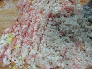 第二步是将五花肉剁成肉沫子,剁的时候里面加上鲜姜和适量盐、十三香等