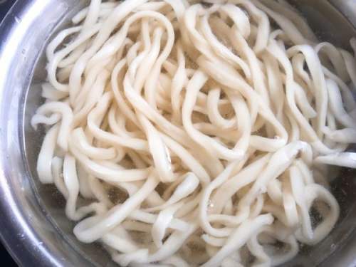 3锅中多放水烧开,下面煮七八成熟,也就是刚没硬心的程度,别煮太软。捞到凉水里过凉
