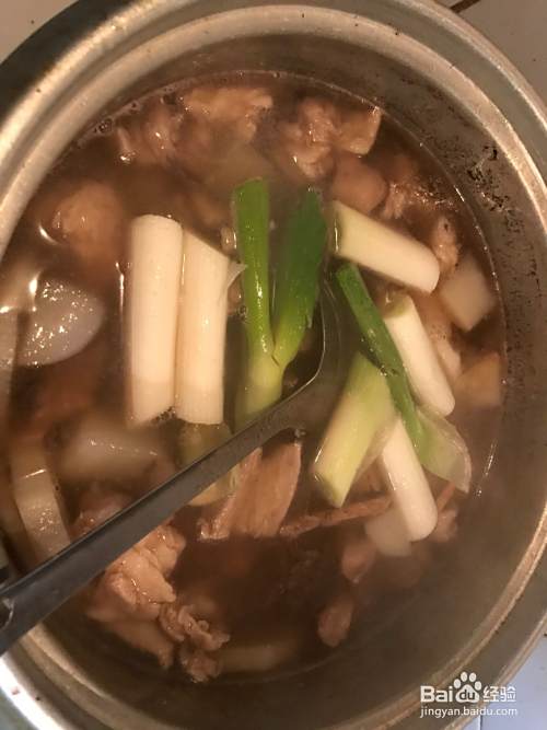 大火熬半个小时之后,放入葱段,萝卜。关小火微煮。