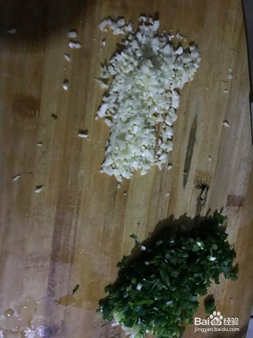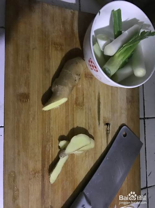 姜块切片,大葱切成小段,把蒜剁细,切上葱花备用。