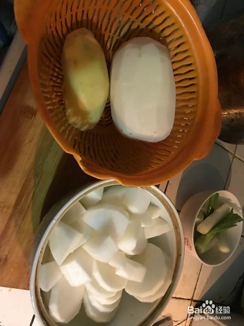 洗干净的白萝卜切成丁 ,土豆,莲藕切成3厘米左右的大小,折耳根摘成小段,洗干净,沥干水分。