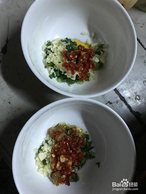 准备好蘸料,这里的辣椒是自己家做的,也可以买的那种小米辣剁碎,吃起来更加可口一些。(吃不了辣的朋友也可以选择不放辣椒,放点辣椒油,耗油之类的可代替)
