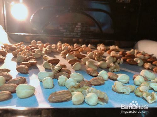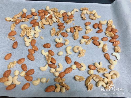 核桃、杏仁、腰果、夏威夷果适量平铺到烤盘里