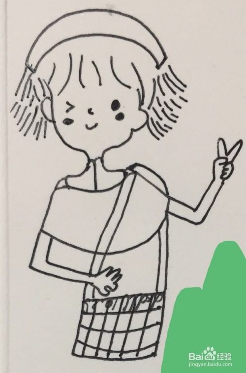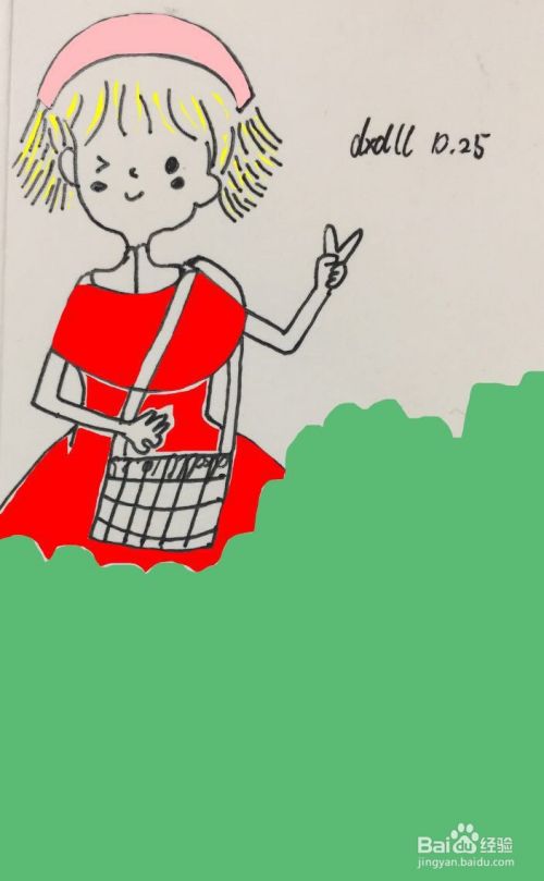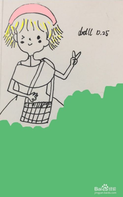 在女孩肩膀处,画出一个书包。在女孩的头顶画出一个发箍。我们用绿色马克笔画出草丛。