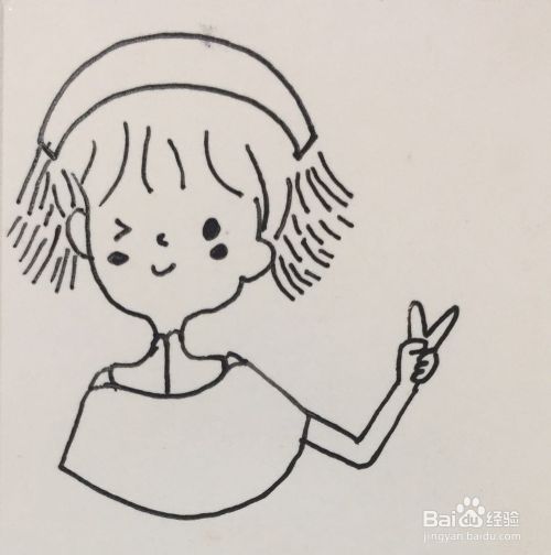 我们用笔画出女孩的脖颈,线条下沿画出肩膀。我们用笔画出女孩的上衣,用笔画出女孩的手臂。