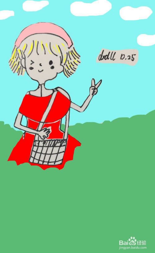粉色马克笔给发箍上色,黄色马克笔给发型上色,红色画笔给女孩的服装上色。白色画笔给白云上色,天蓝色画笔给天空上色。