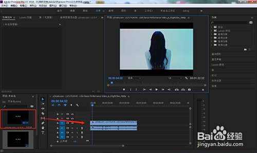 长按鼠标左键,将左侧导入的文件素材拖动到右侧时间轴上。