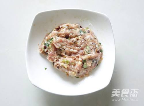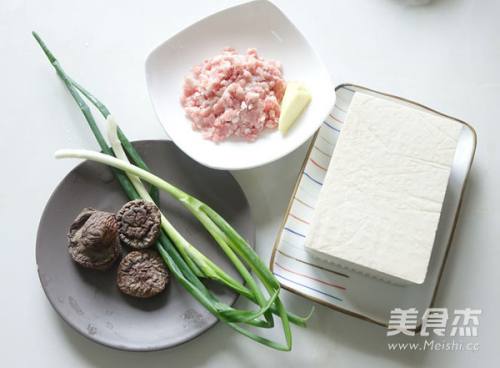 22.豆腐切成小方块,中间挖出一个小孔。香菇切成末,姜切成末,葱切成葱花。