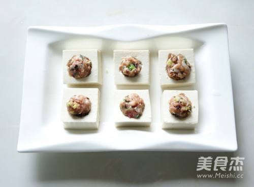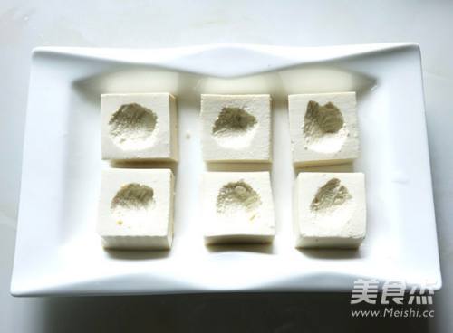 44.用勺子将肉末放入豆腐孔中,摆好盘。