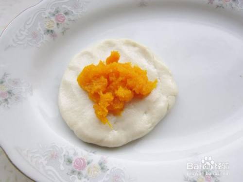 把面团按扁,放适量南瓜馅