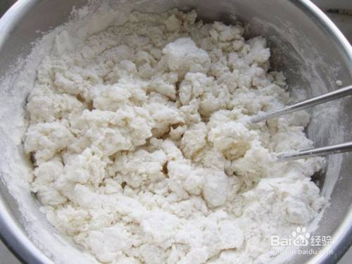 把开水缓慢倒进面粉里,边倒水边搅拌