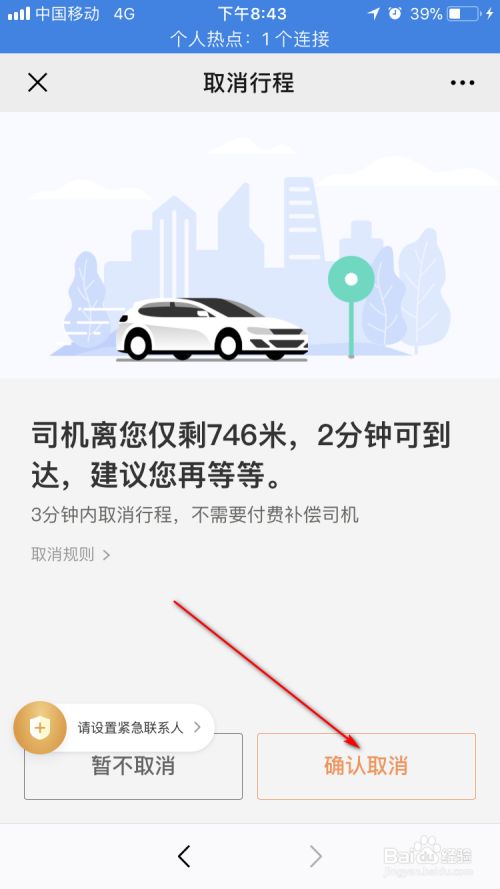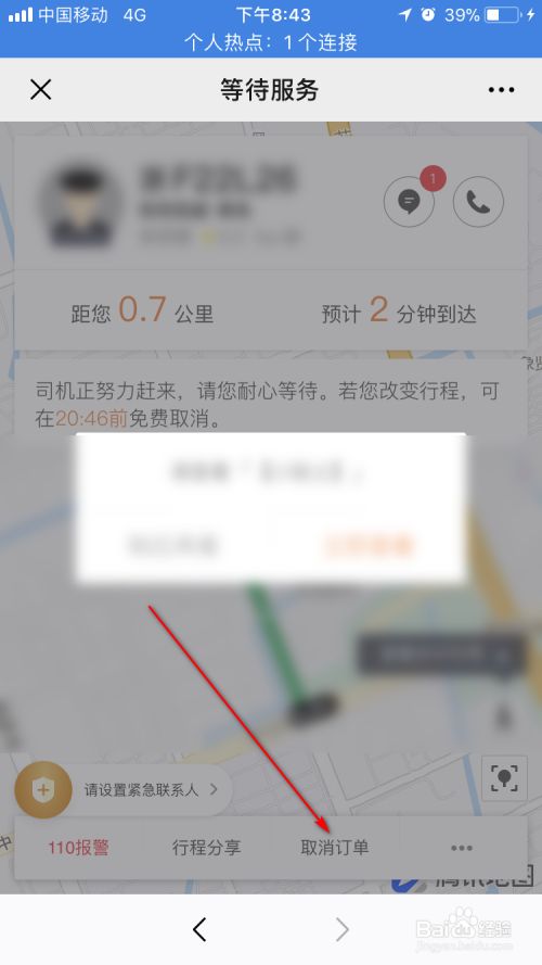 然后,耐心等待,当司机接收订单后,界面会显示相应的信息。然后如果我们由于其他原因需要取消该订单的,点击下方的【取消订单】按钮。