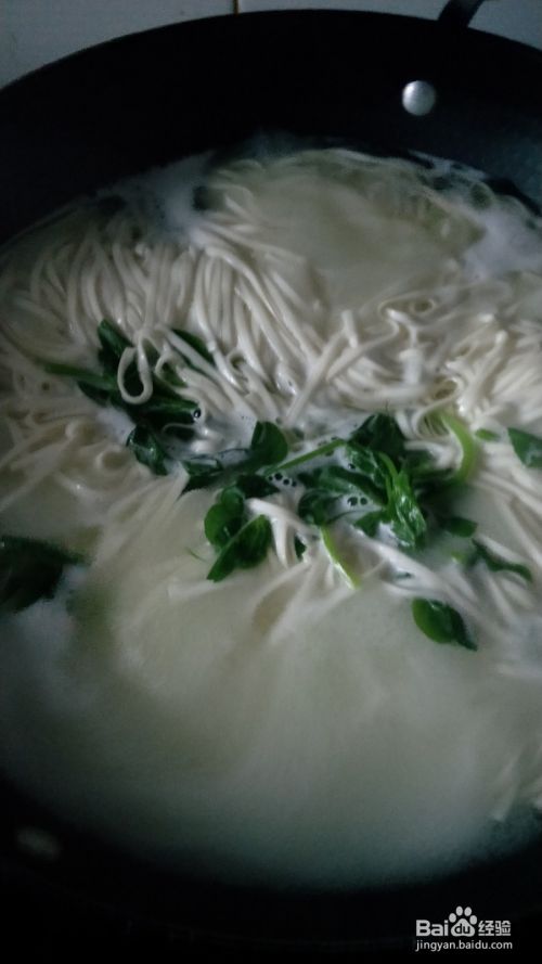 大概五分钟后放入豆苗,豆苗的颜色变后就可以捞出,放入碗里