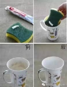 不管是泡茶叶咖啡牛奶的杯子都利用上面所说的方法都可以去除杯子污垢的,提醒一下,泡完豆奶粉牛奶的杯子要立刻刷洗,不然放的时间越长,杯子里的味道都很难闻,味道大