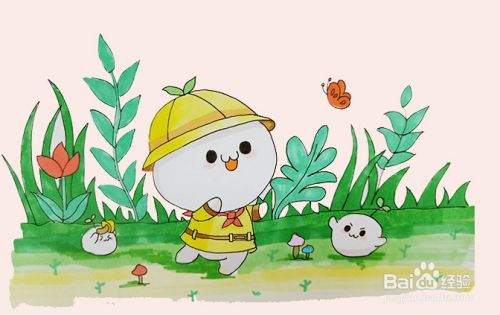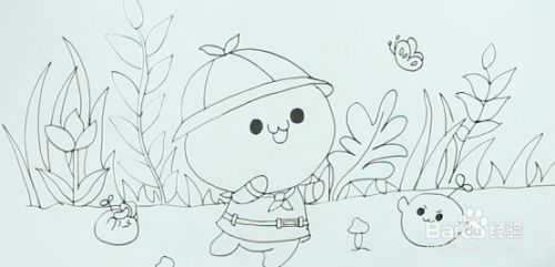 接着在旁边画出一只小蝴蝶,在地上还有两只头上长草的小团子;