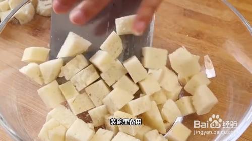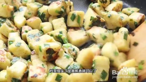 平底锅起锅烧油,倒入馒头丁,将馒头丁摊平,用小火慢慢煎炒,炒至馒头丁金黄焦香就可以了。