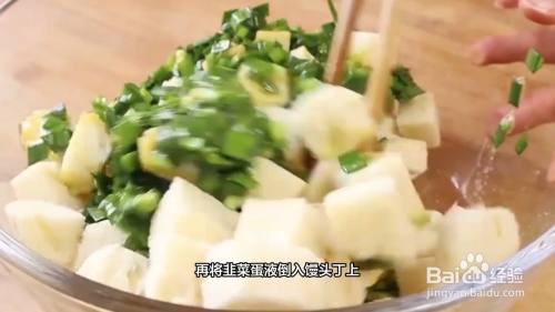 再将韭菜蛋液倒入馒头丁上,翻拌均匀