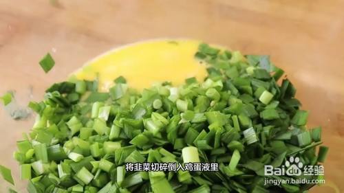 在碗中打入鸡蛋备用,将韭菜切碎倒入鸡蛋液里,加入一勺胡椒粉,一勺盐,搅拌均匀