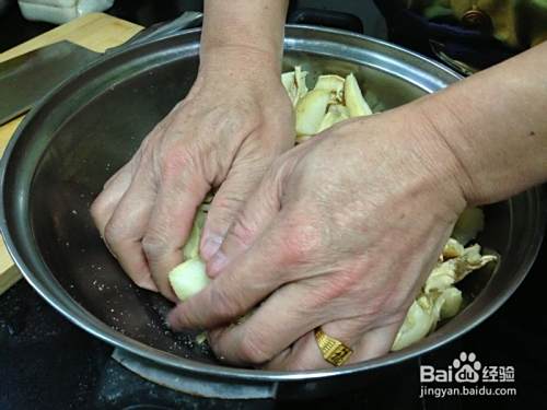 第六步,揉透萝卜干。接下来,我们取来食用盐,取一定量的盐放入萝卜里,然后用力的揉,感觉揉透,萝卜干变软了,就行了。