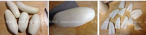第二步,我们要做的就是把萝卜表皮有疤点的地方用小刀挖掉。然后,我们用菜刀把萝卜切段,再切片,但不要切断了,有一部分要连着。