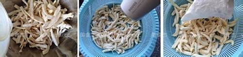 晒好后,我们将萝卜条从衣架上(或者绳上)取出,相连的地方撕开成一条条的,比较大的,我们可以用菜刀切小一下。